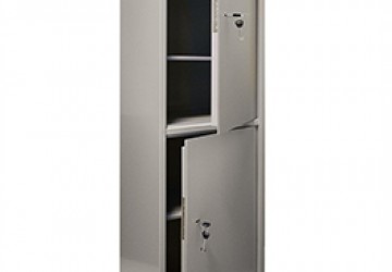 Шкаф представляет собой сварную металлическую конструкцию прямоугольной формы. Горизонтальная перегородка делит шкаф на 2 независимых отделения, запираемых собственной дверью. Корпус и двери шкафа изготовлены из стального листа толщиной 1,2 мм. Двери изнутри усилены панелью коробчатого сечения из стального листа толщиной 0,8 мм. Шкаф комплектуется 2-мя съемными регулируемыми по высоте полками, а верхнее отделение шкафа дополнительно оборудовано отсеком ограниченного доступа (трейзер), запираемым замком «почтового» типа. Петли шкафа – внутренние.