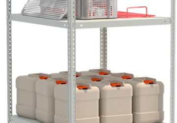- Для обеспечения жесткости конструкции стеллажа, нижняя горизонтальная пока устанавливается на расстоянии не более 150 мм от пола и крепится по 4 углам к стойкам через металлические уголки жесткости. Верхние уголки жесткости крепятся к 4 углам полки, расположенной на расстоянии не более 2 м от пола.