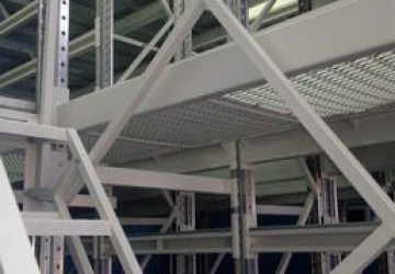 Сборно-разборные секции состоят из нескольких продольных стоек, поперечных балок, которые соединяются диагональными раскосами, обеспечивающими пространственную прочность мезонинных конструкций-стеллажей. При монтаже образуется необходимая ярусность. На этажах предусмотрены перильные ограждения, исключающие падение хранимых вещей, травмирование персонала. «Этажерки» оборудуются дополнительными деталями, облегчающими эксплуатацию мезонинных конструкции. Для комфортного подъема грузов на верхние секции можно использовать лифты, электротали. К мезонину беспрепятственно подъезжают штабелеры, грузоподъемники.