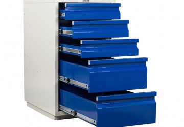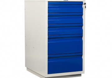 - Тумба укомплектована 5-ю выдвижными ящиками. Телескопические напрявляющие. Нагрузка на ящик 30 кг. Все ящики закрываются на центральный ключевой замок.