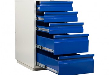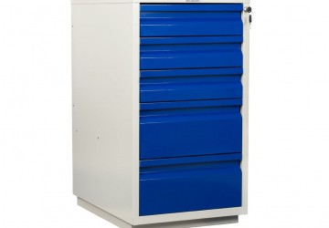 - Тумба укомплектована 5-ю выдвижными ящиками. Телескопические напрявляющие. Нагрузка на ящик 30 кг. Все ящики закрываются на центральный ключевой замок.