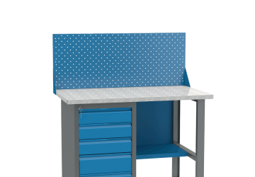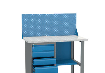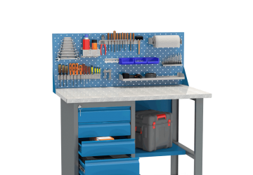 - Верстак имеет надежную модульную конструкцию с усиленной столешницей (плита МДФ 25мм, покрытая листом оцинкованного металла).