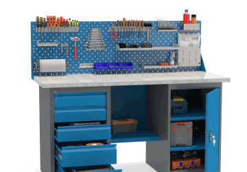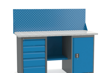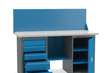 - Верстак укомплектован драйвером с пятью выдвижными ящиками разными по высоте и тумбой с полками.