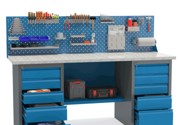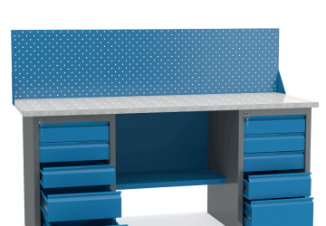- Верстак укомплектован двумя драйверами, каждый из которых оснащен пятью выдвижными ящиками разными по высоте.